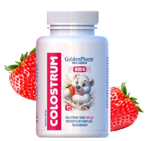 Zadbaj o odporność i dobre samopoczucie swojego dziecka z wyjątkowym suplementem COLOSTRUM KIDS 40%! Te pyszne tabletki w kształcie misiów łączą moc siary (colostrum) z kompleksem probiotycznym i witaminami, zapewniając wsparcie dla układu odpornościowego i równowagi mikrobioty jelitowej. Produkt został stworzony z myślą o najmłodszych, łącząc skuteczność składników z przyjemnym smakiem.