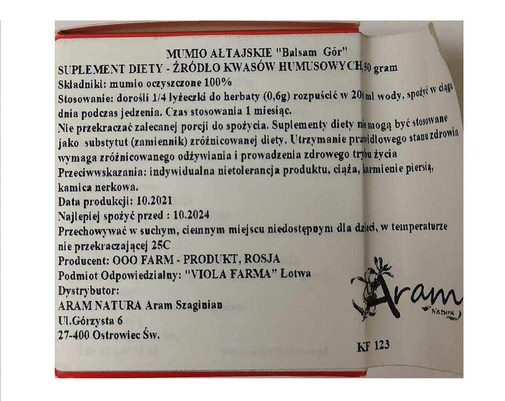 Produkt marki Farm Produkt jest zgłoszony i wpisany do rejestru Głównego Inspektoratu Sanitarnego (GIS), co stanowi gwarancję bezpieczeństwa oraz najwyższej jakości oferowanego surowca. Wybierając Mumio z Ałtaju, stawiasz na czystą moc minerałów zamkniętą w tradycyjnej formie Balsamu Gór.