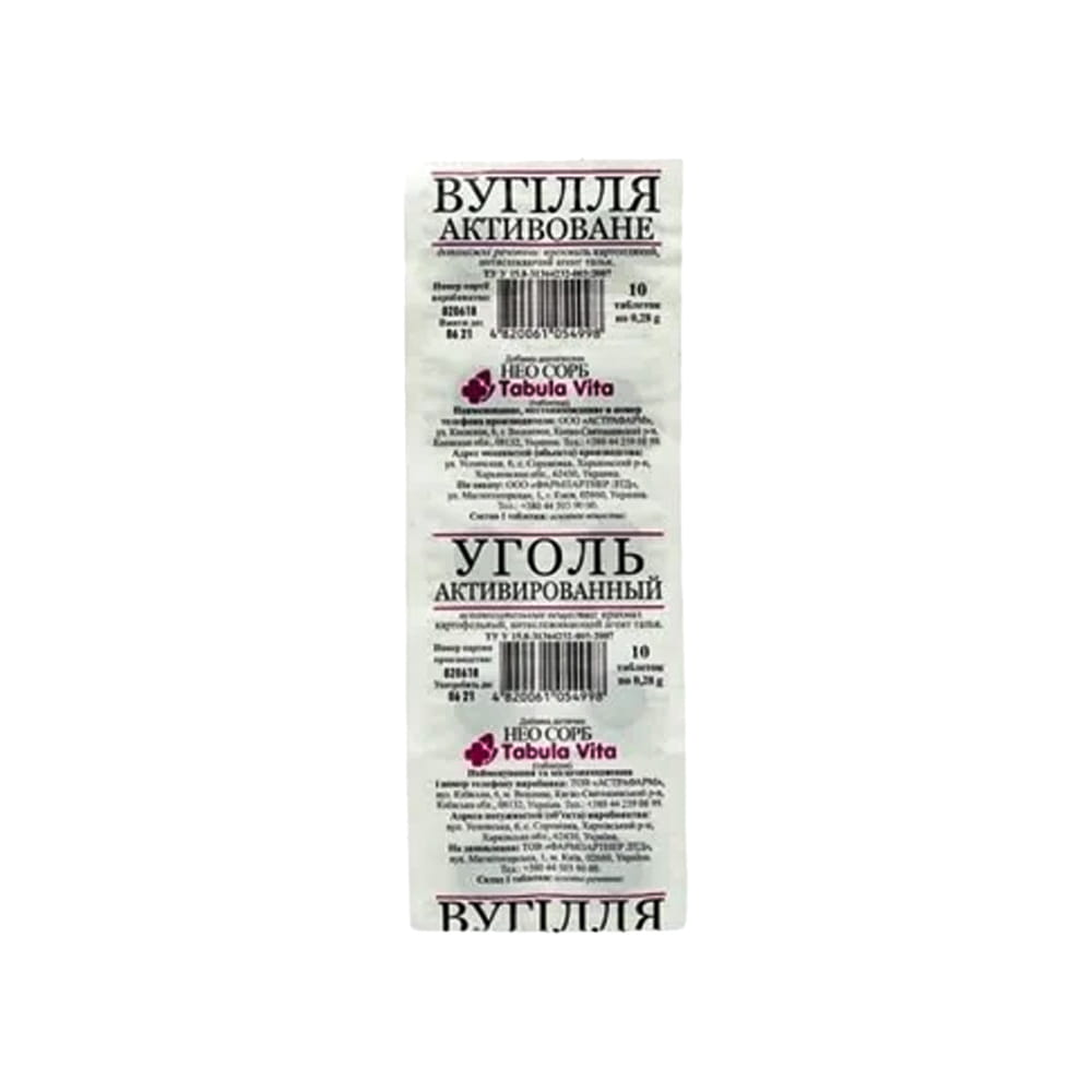 Skład 1 tabletki: węgiel aktywny (0,25 g), skrobia ziemniaczana (0,0275 g), talk antyzbrylający (0,0025 g).
