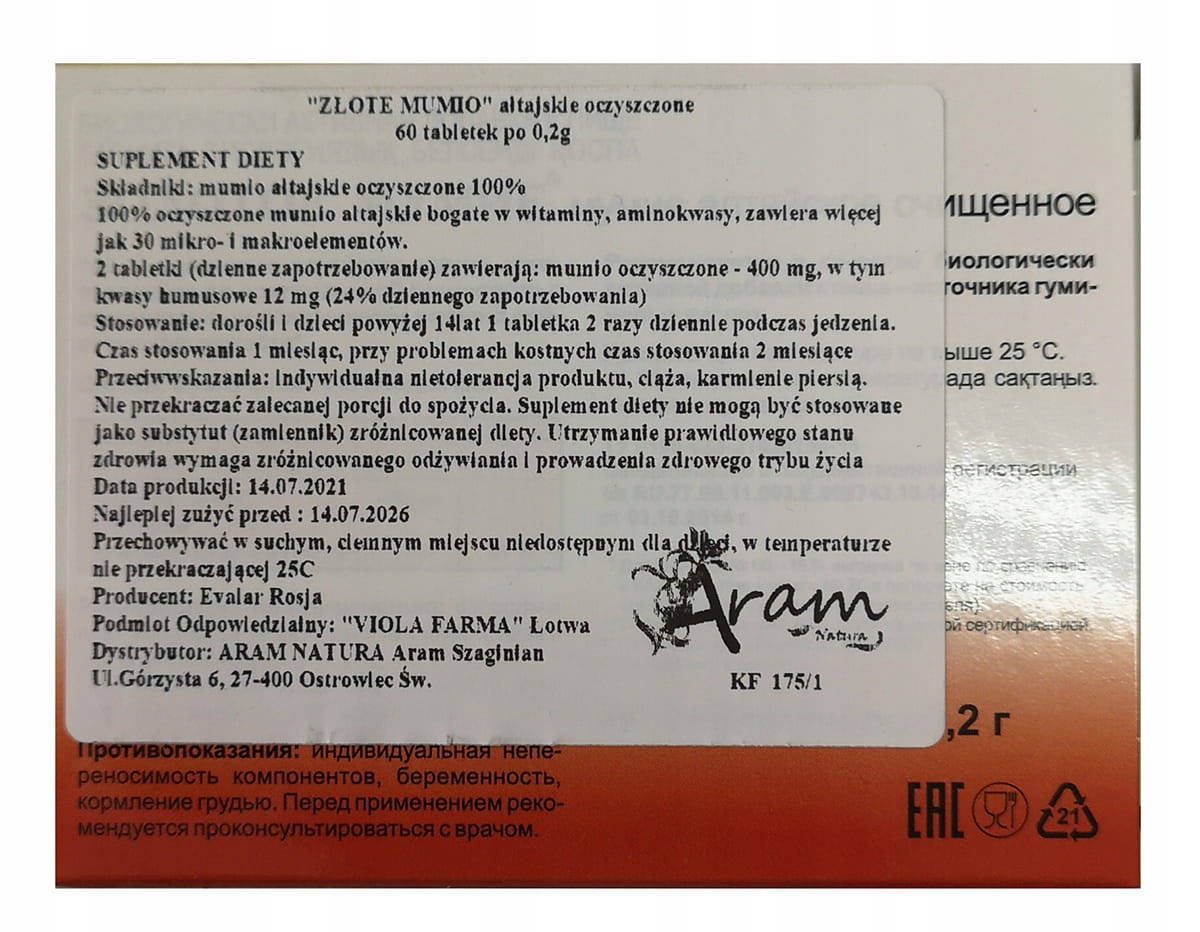 Złote Mumio Ałtajskie Evalar (60 tab.) to najczystsza forma naturalnego biostymulatora pochodzącego z gór Ałtaj. Produkt bogaty w ponad 30 mikroelementów i aminokwasów, wytworzony bez użycia substancji pomocniczych.